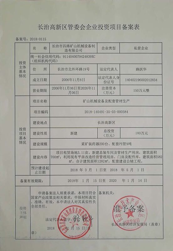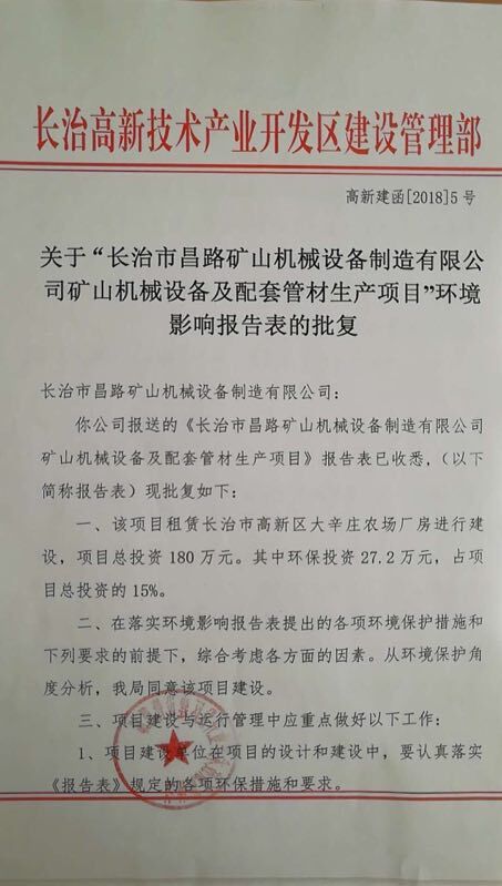 關于“長治市昌路礦山機械設備制造有限公司礦山機械設備及配套管材生產項目”環(huán)境影響報告表的批復